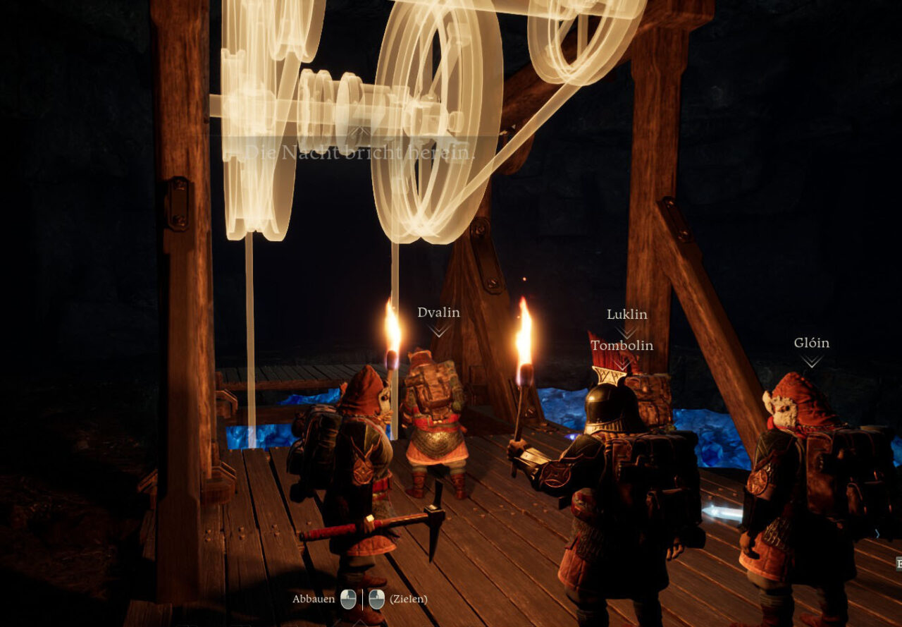 Ich bin aber wieder voll dabei als es daran geht einen Weg über den See zu finden und da lernen wir das erste Mal die Quickbuild-Funktion kennen. So platzieren wir Platten aus Holz und Stein, um das kühle Nass zu überwinden. Denn schwimmen können Zwerge nicht. Fühlt sich irgendwie gemogelt an, ich weiß bis heute nicht ob es so gedacht war, klappt aber.