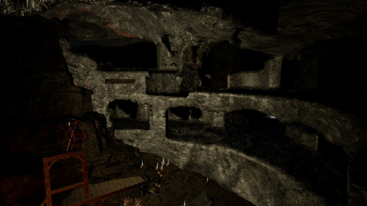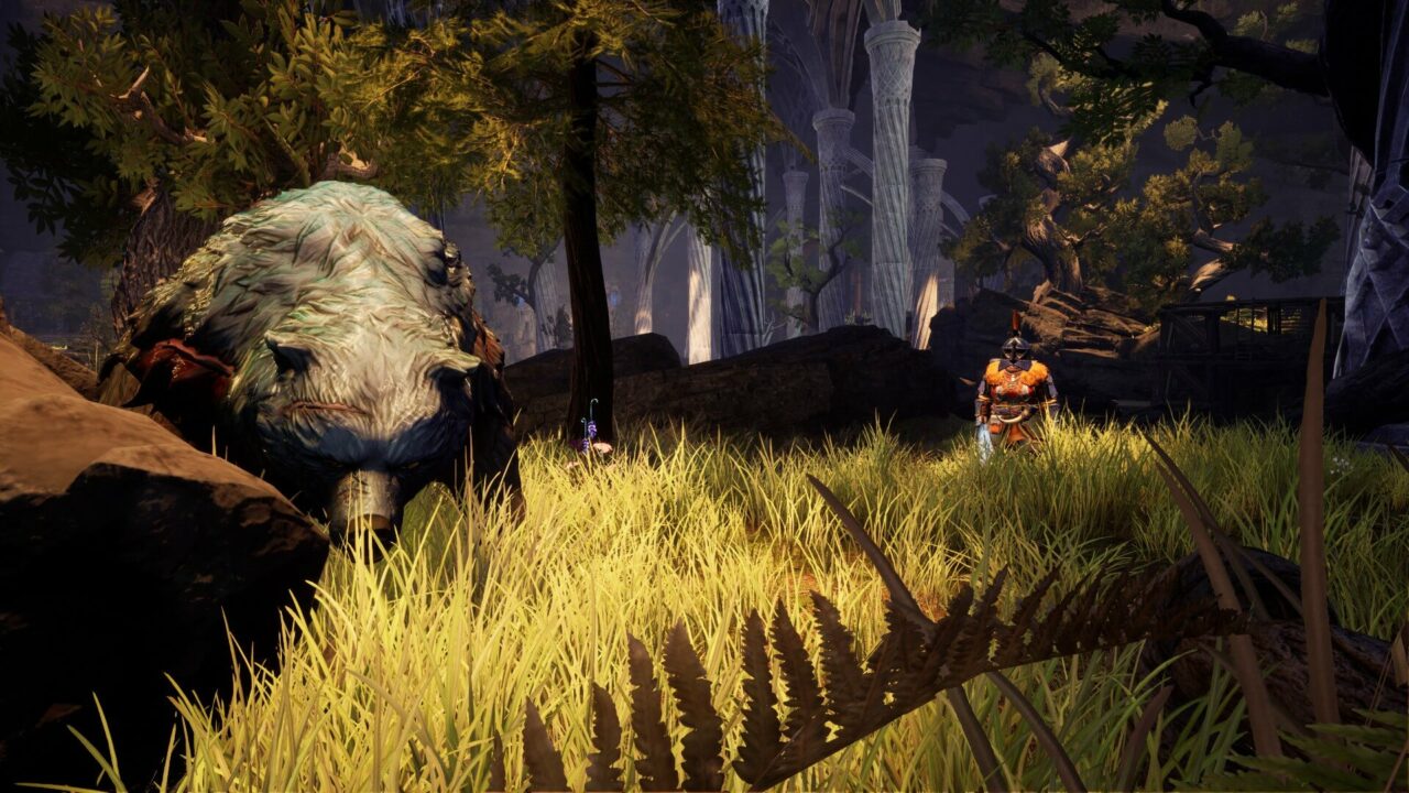 Mit neuen Materialien und dem Entdecken des Baumenüs starten wir unsere erste Basis. Irgendwie wird das Ding am Ende aber nur ein halbes Haus, vielleicht aus Materialmangel. Während des Baus treffen wir auf eine erste Herausforderung im Gegnergewand: einen Bären. Ich erinnere mich daran, wie wir da zu viert drauf gekloppt haben und zwischendurch sogar jemand down gegangen ist (man kann wiederbeleben). Aber schließlich haben wir es gepackt. Ich bin heute noch mal mit unserem aktuelleren Equipment auf einen Bären gestoßen und da hatte der nicht mehr viel zu melden. Denn so läuft es in Return to Moria: Man sucht Rohstoffe, baut sich neue Werkzeuge zusammen, findet neue Rohstoffe und crafted neue, stärkere Waffen.
